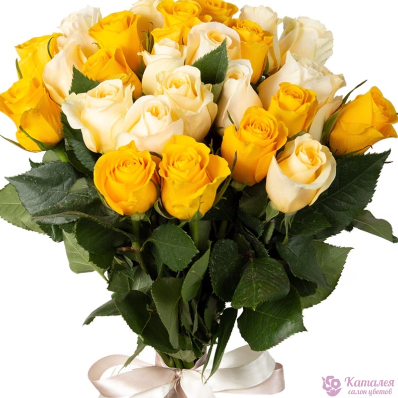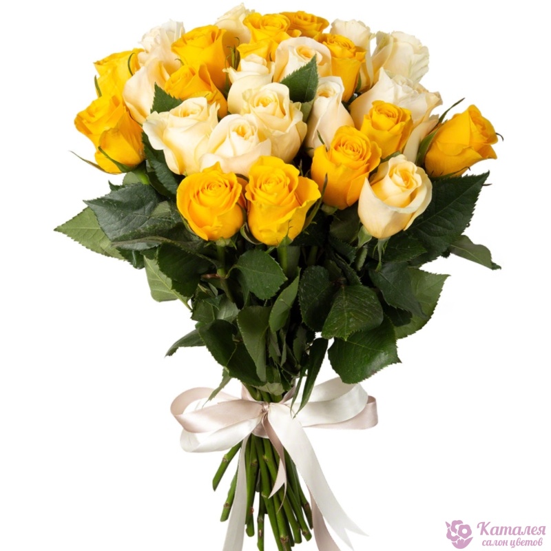 Букет состоит из 16 белых роз, 15 желтых роз, прозрачная упаковка, атласная лента.