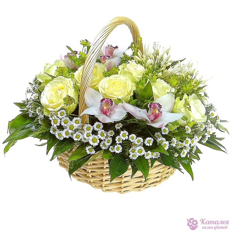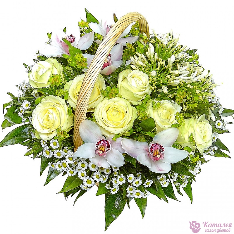 Букет состоит из 7 белых роз, 5 орхидей, 6 веток хризантем Сантини, 3 агапантуса, зелень, корзина, оазис.