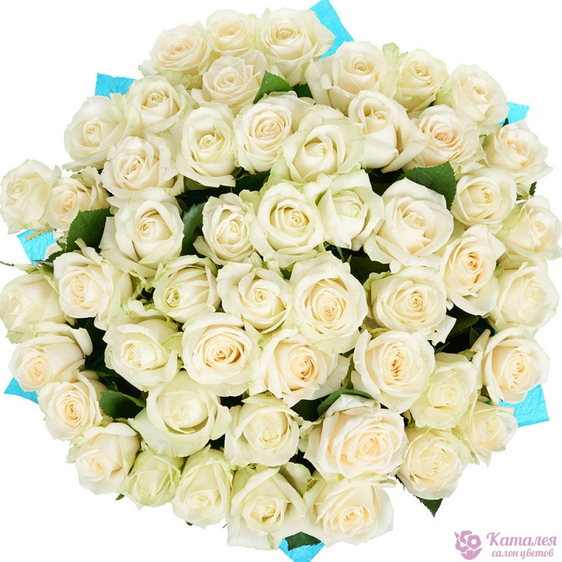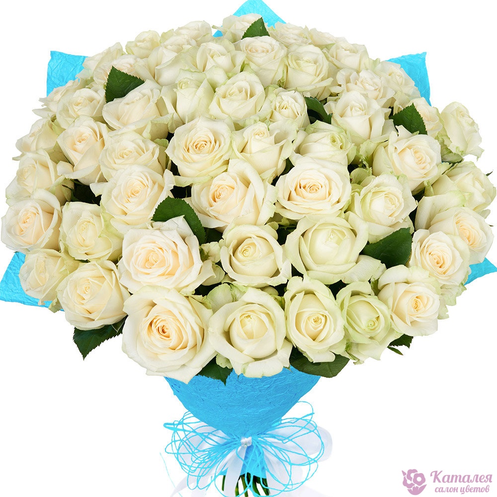 Букет состоит из 55 белых роз, красивая упаковка, атласная лента.