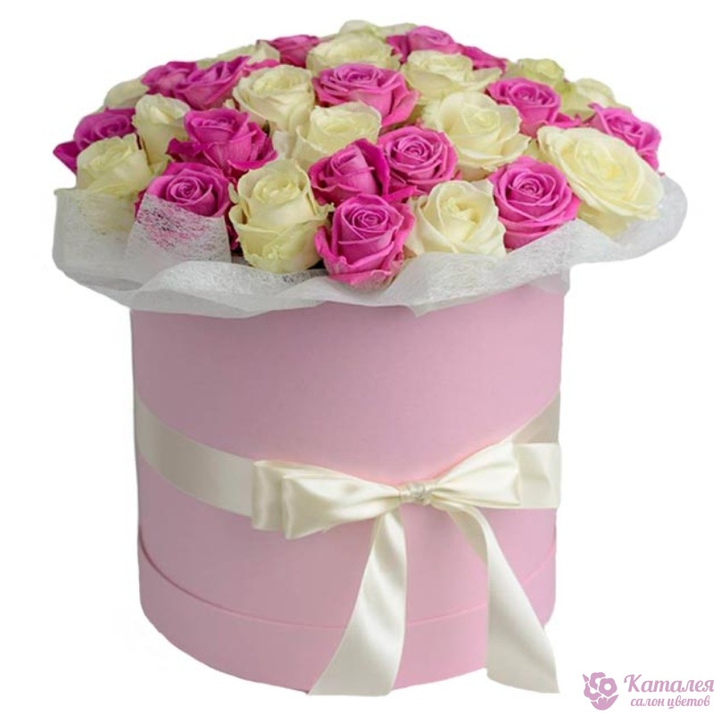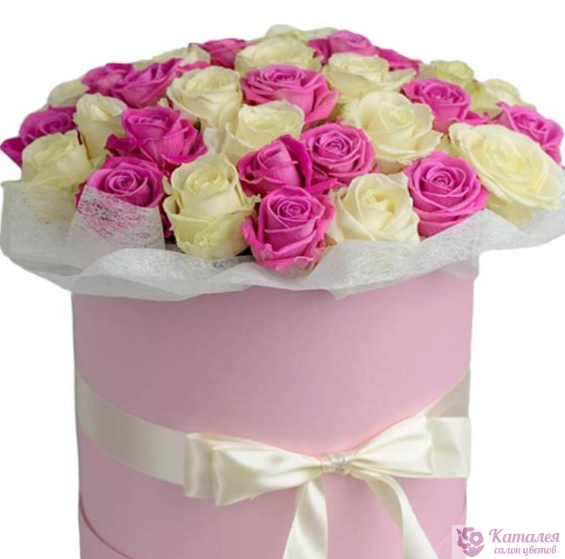 Букет состоит из 26 белых роз, 25 розовых роз, коробка, атласная лента.