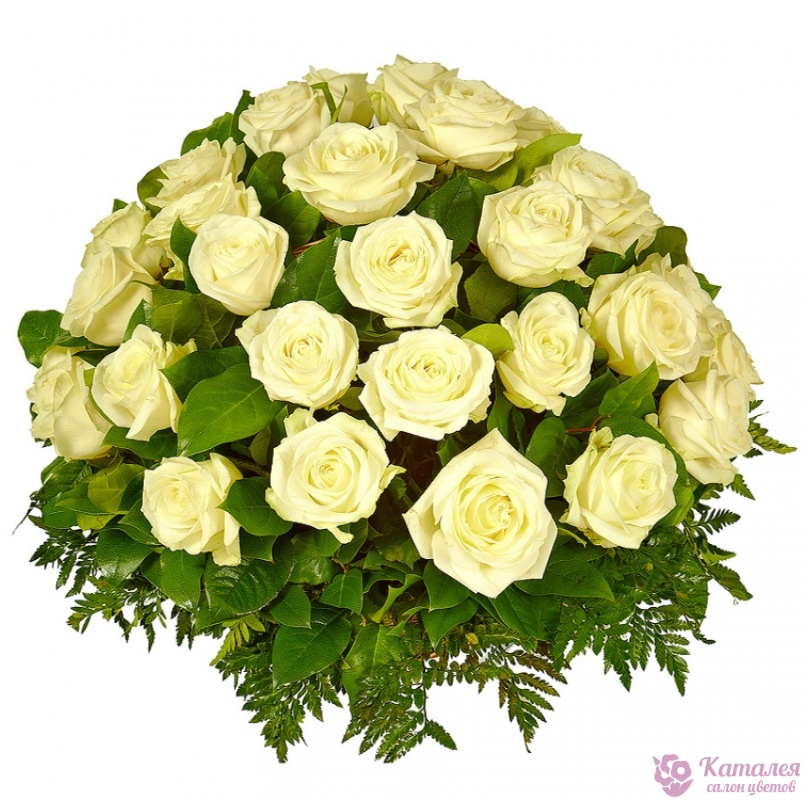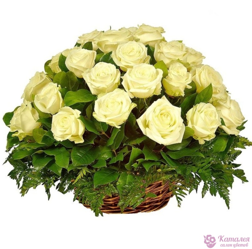 Корзина из 35 белых роз с зеленью