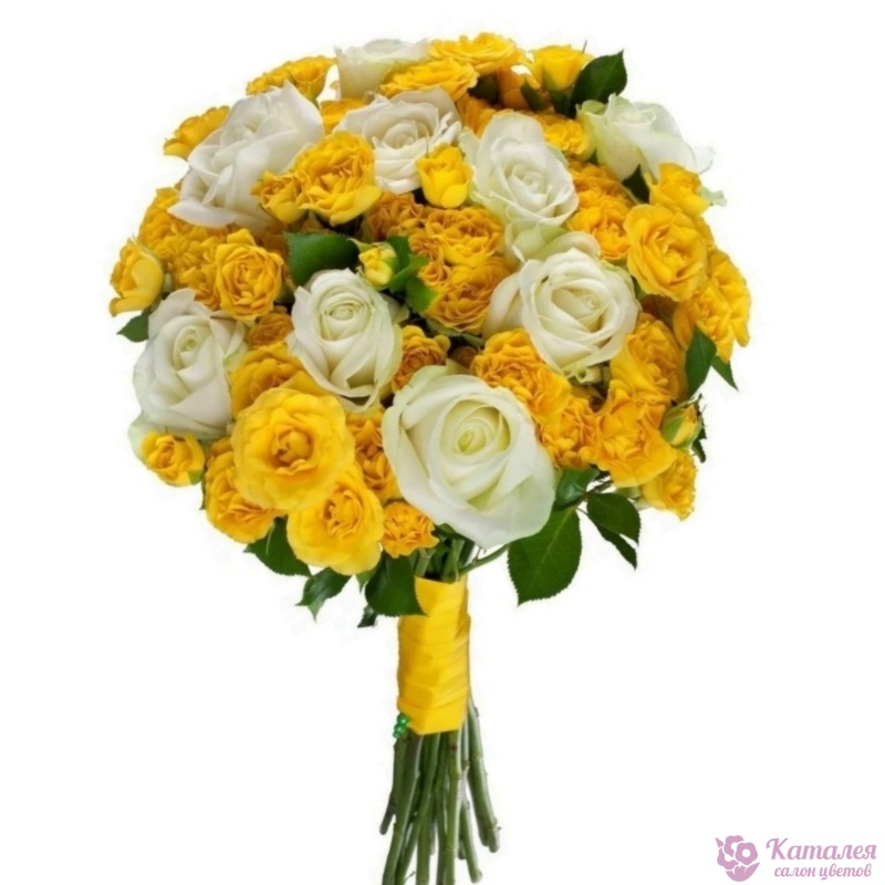 Букет состоит из 11 белых роз, 10 желтых кустовых роз, атласная лента.