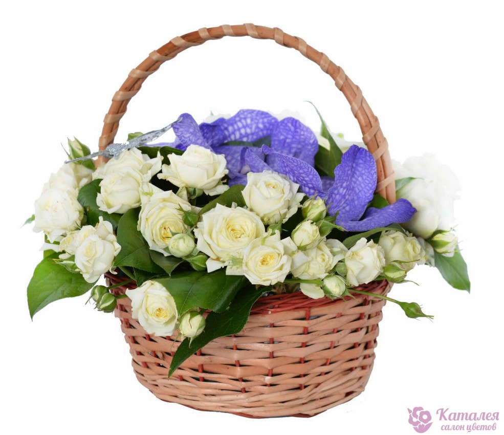 Букет состоит из 7 веток кустовой розы, 7 веток эустомы, 3 орхидеи, зелень, корзина, оазис.