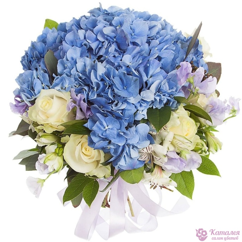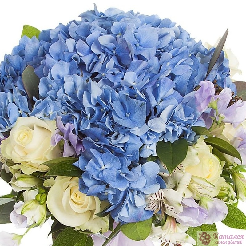 Букет состоит из 1 синяя гортензия, 7 белых роз, 4 ветки альстромерии, зелень, прозрачная упаковка, атласная лента.