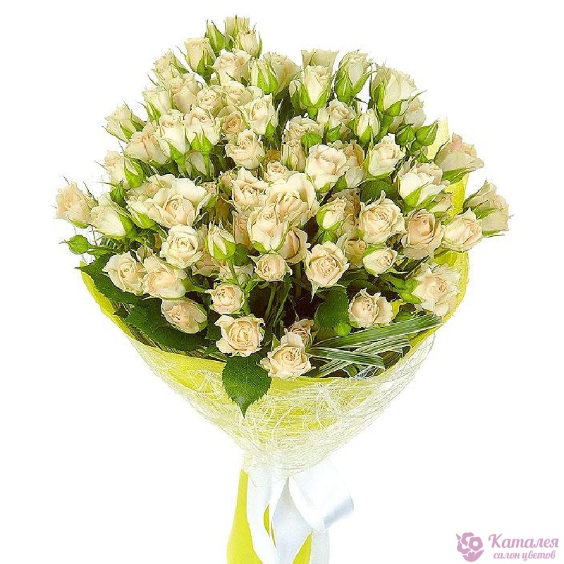 Букет состоит из 11 белых кустовых роз, зелень, красивая упаковка, атласная лента.