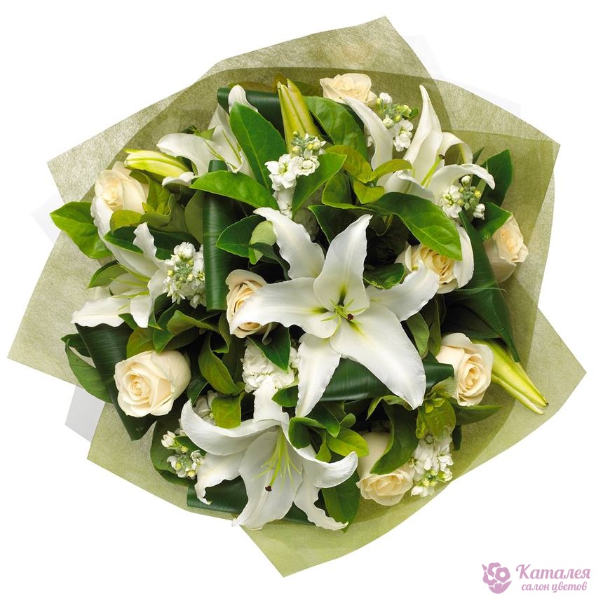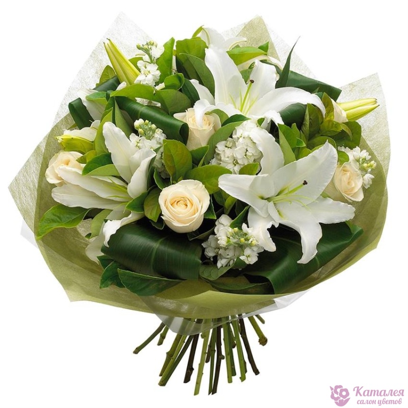 Букет состоит из 5 белых роз, 3 белые лилии, 5 веток белой маттиолы, зелень, фетр, атласная лента.