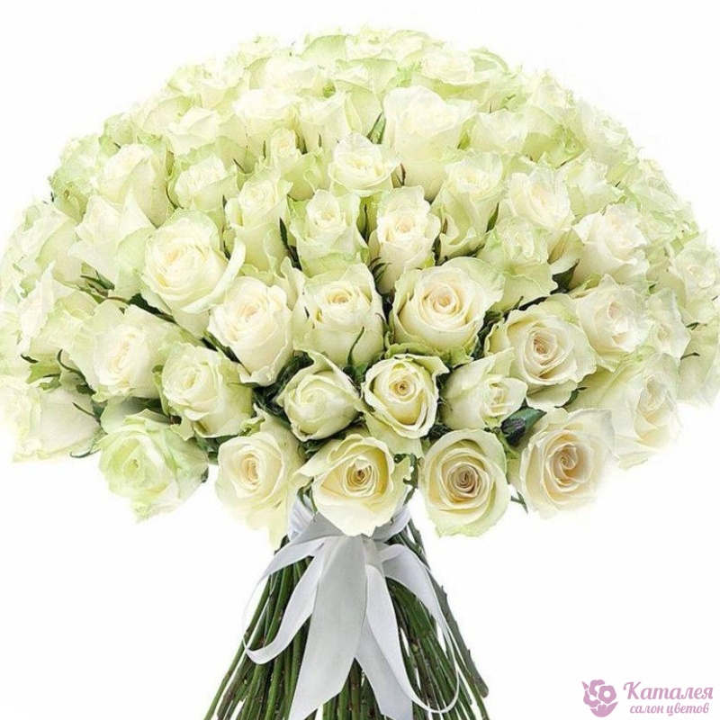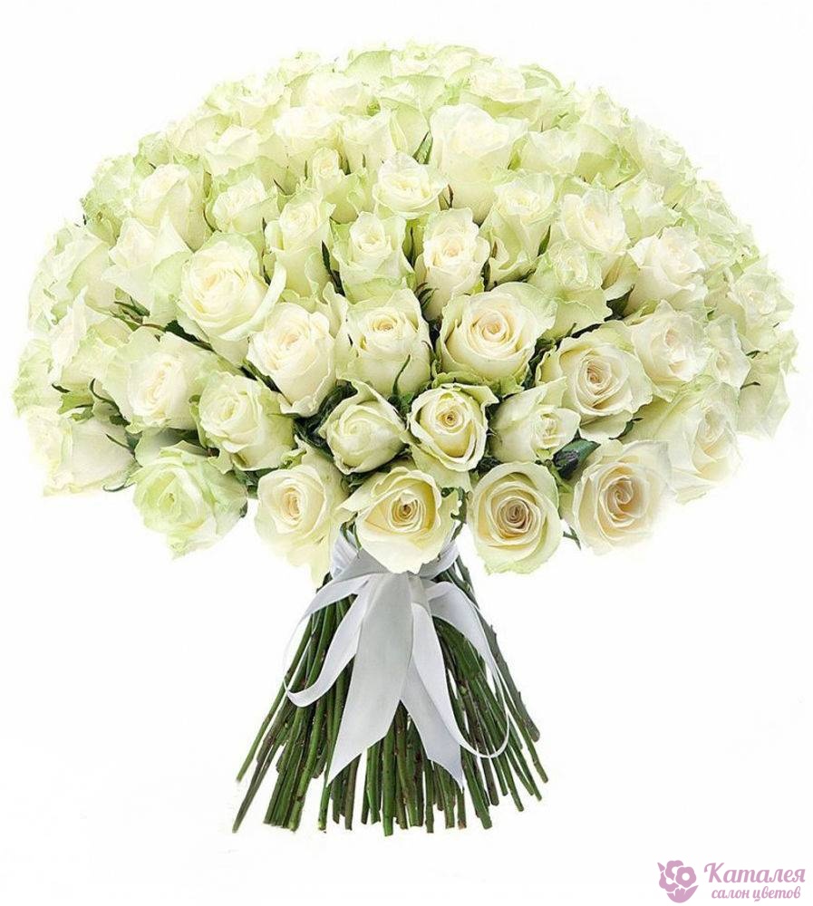 Букет состоит из 101 белая роза Кения, прозрачная упаковка, атласная лента.