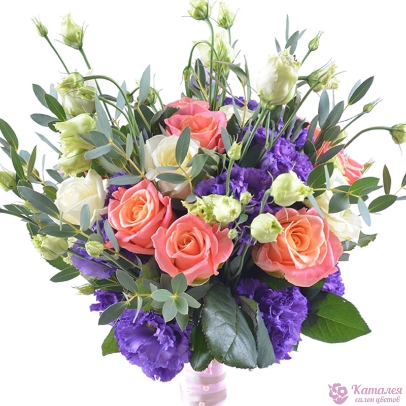 Букет состоит из 15 коралловых и белых роз, 6 веток эустомы, эвкалипт, прозрачная упаковка, атласная лента.