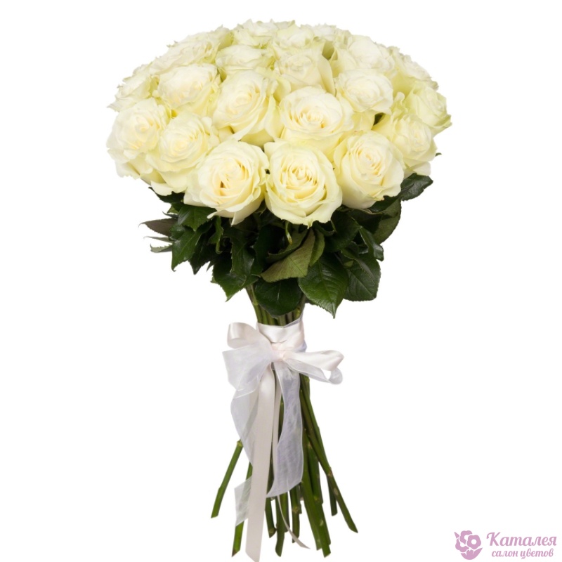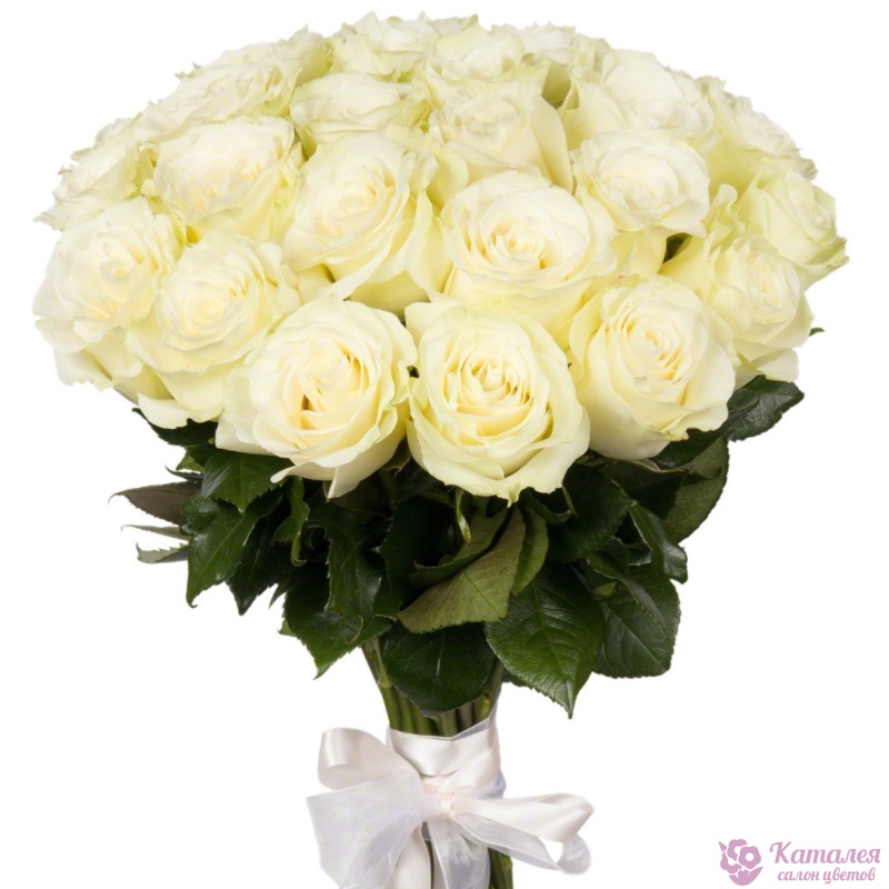 Букет состоит из 21 белая роза, прозрачная упаковка, атласная лента.