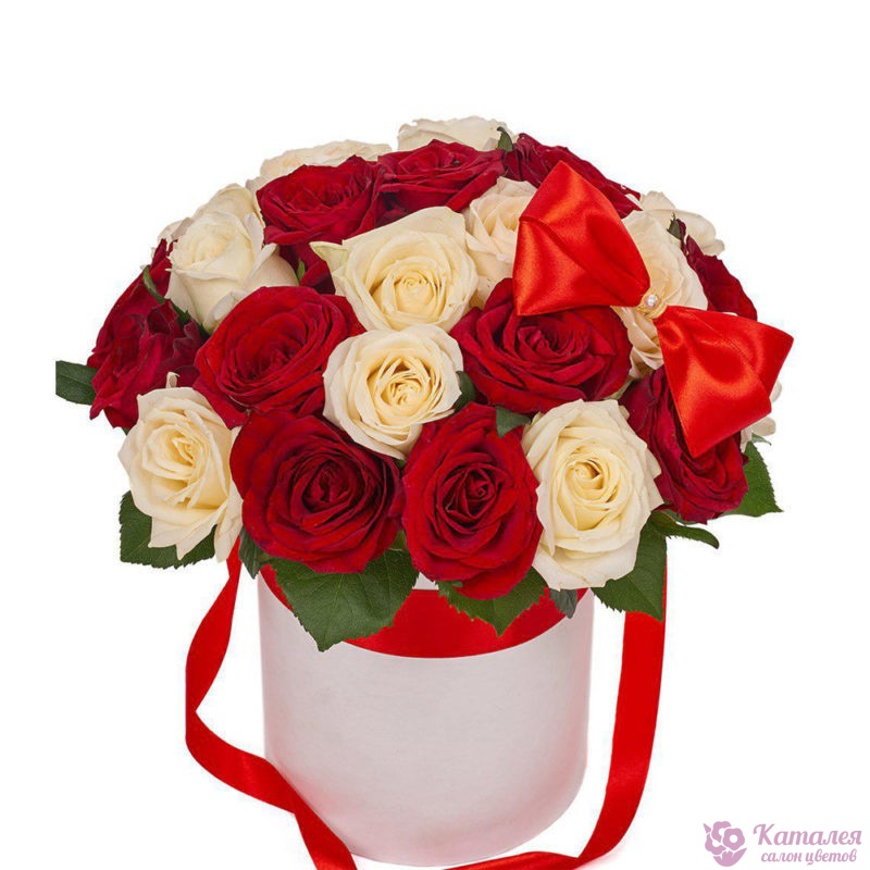 13 красных роз, 12 белых роз, белая коробка, красная лента, оазис, зелень.