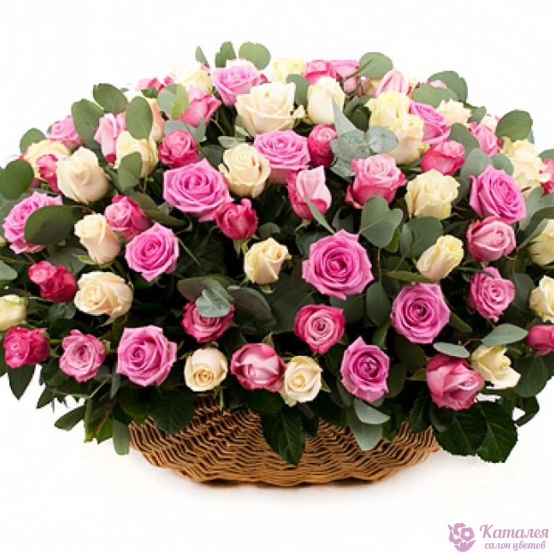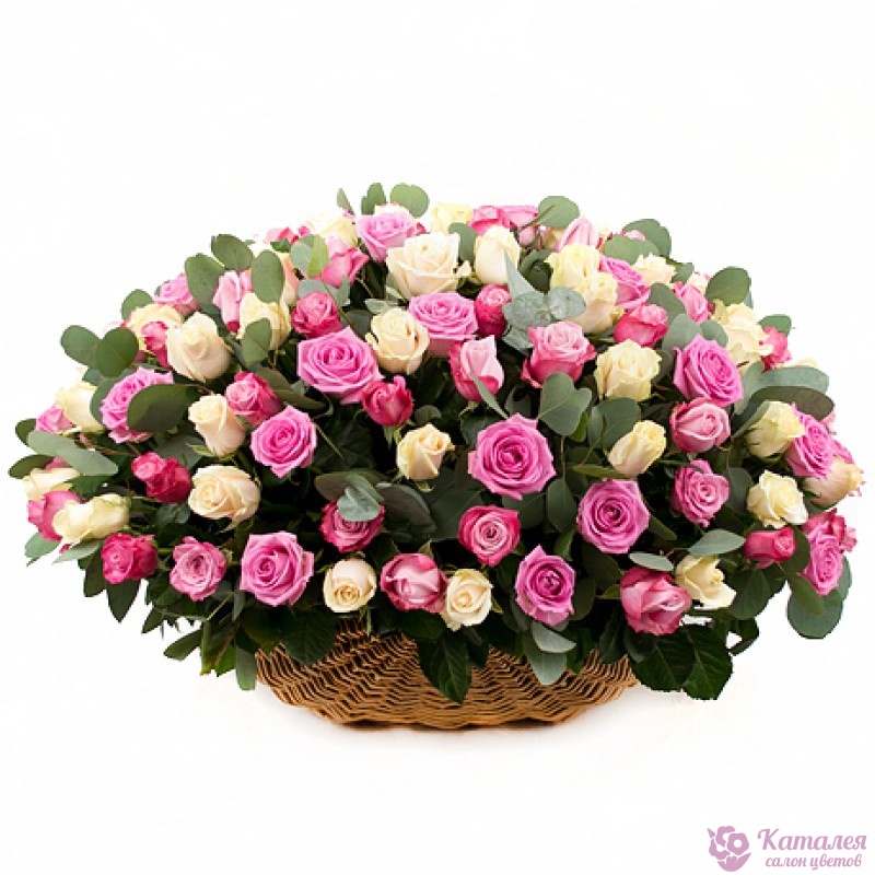 Букет состоит из 50 белых роз, 51 розовая роза, зелень, корзина.