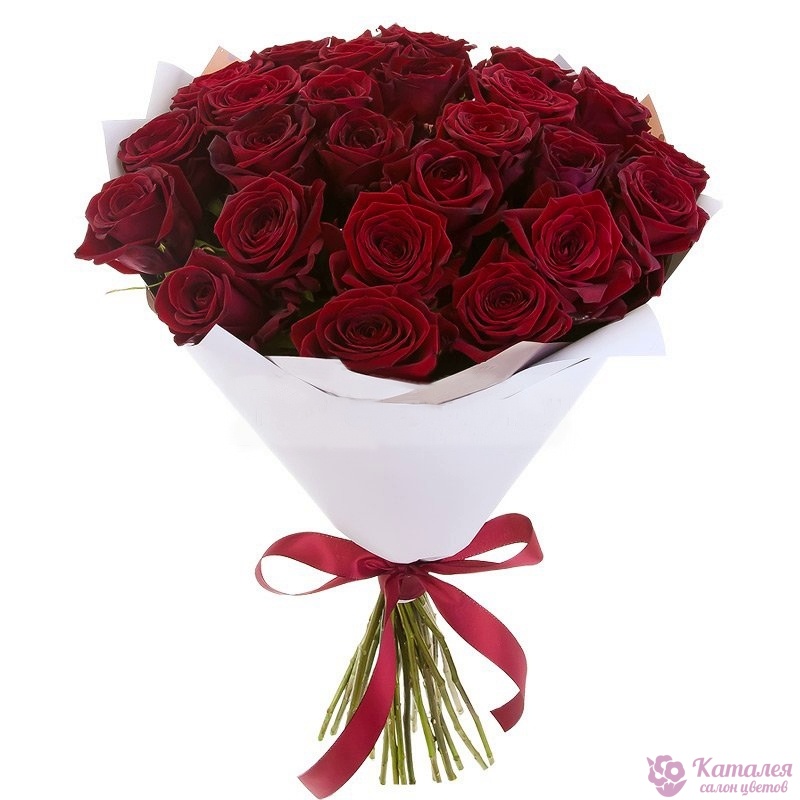Букет из 25 бордовых роз в белом крафте