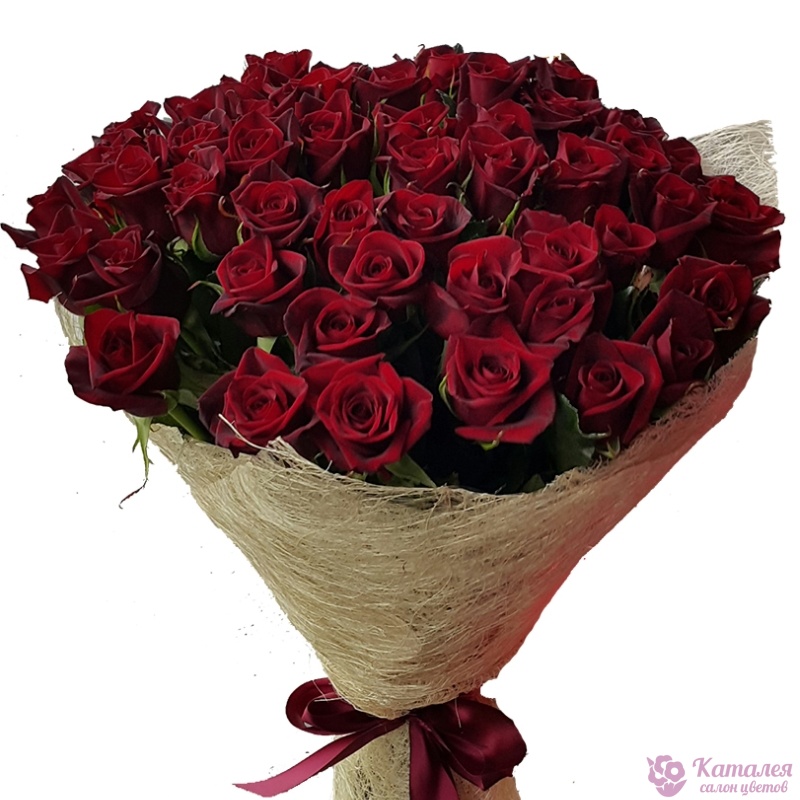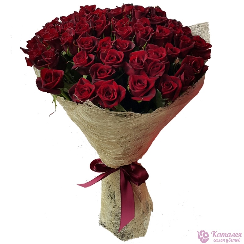 Букет состоит из 45 бордовых роз, сизаль, лента.