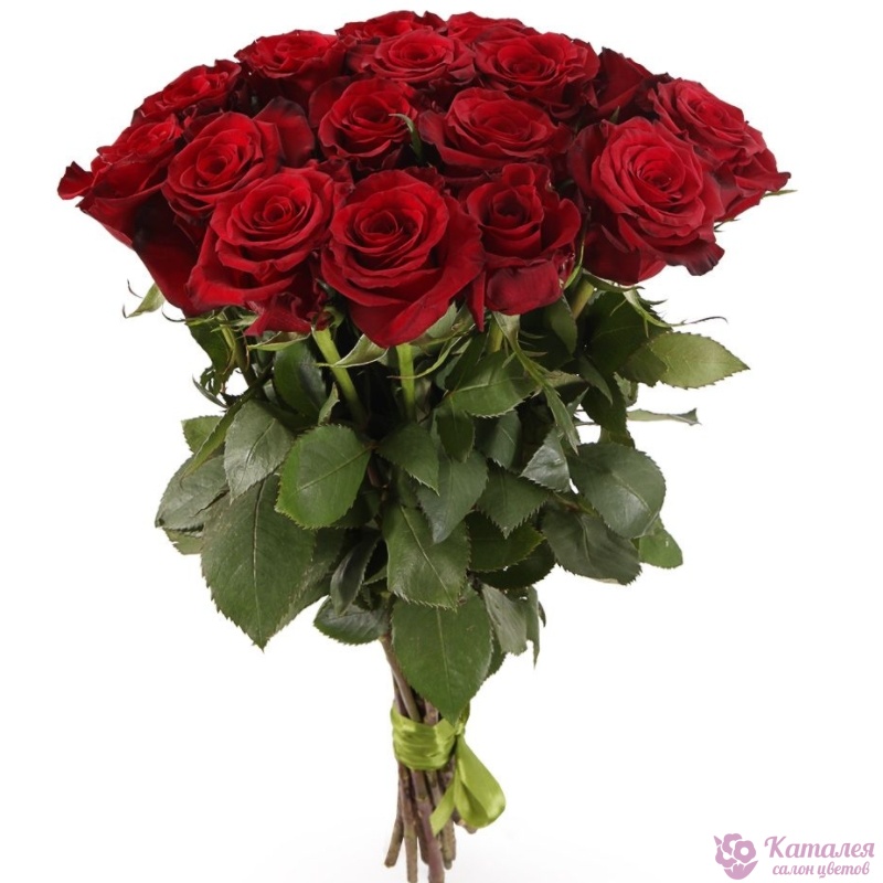 Букет состоит из 19 бордовых роз, прозрачная упаковка, атласная лента.