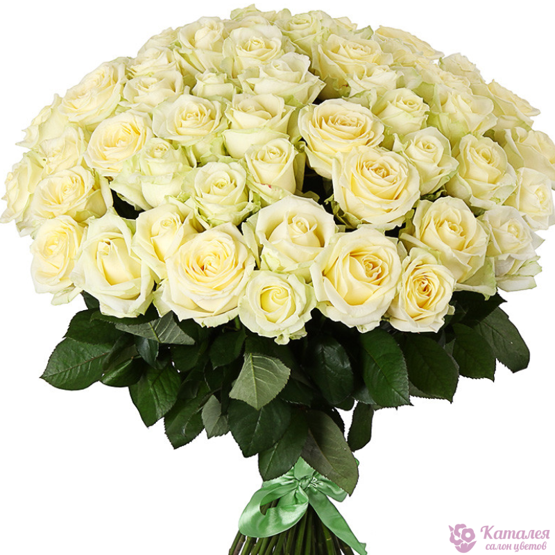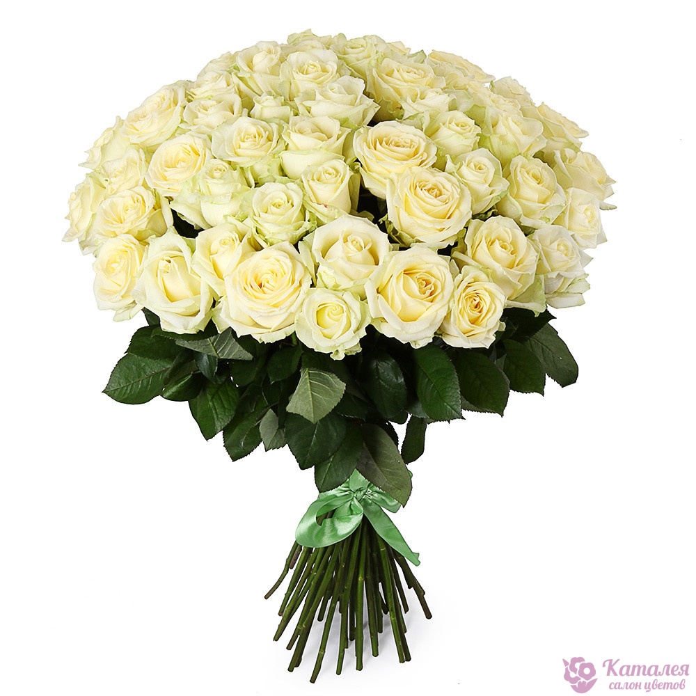 Букет состоит из 75 белых роз, прозрачная упаковка, атласная лента.