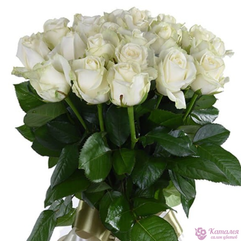 Букет состоит из 19 белых роз, прозрачная упаковка, атласная лента.