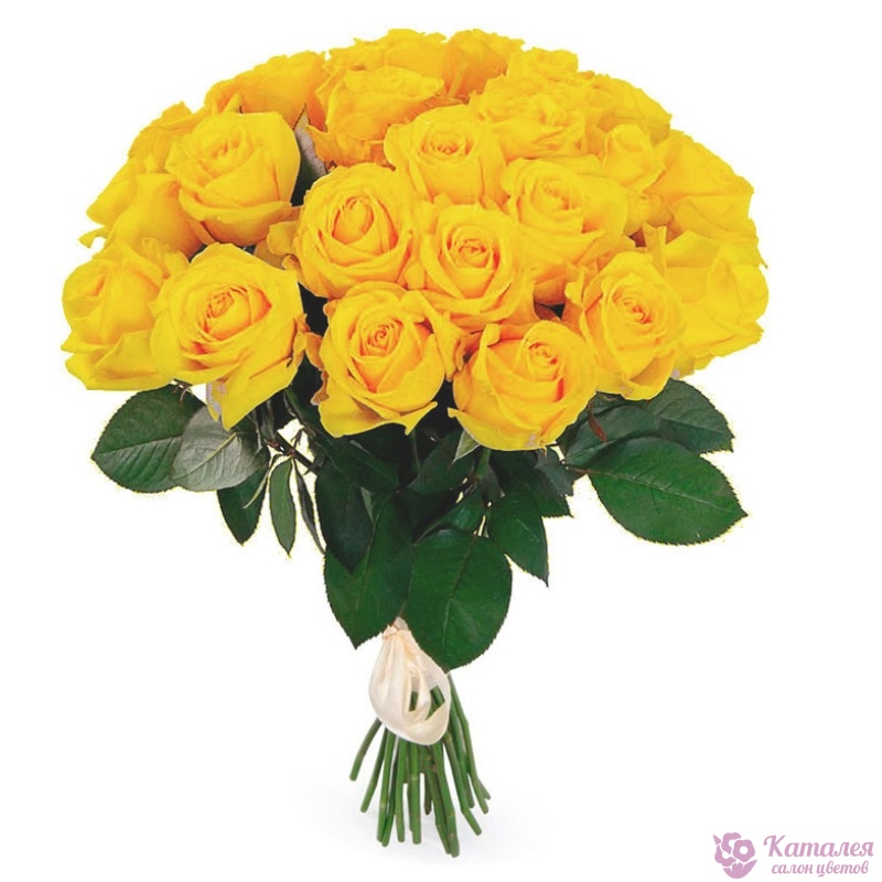 Букет состоит из 31 желтая роза, прозрачная упаковка, атласная лента.