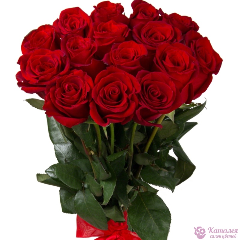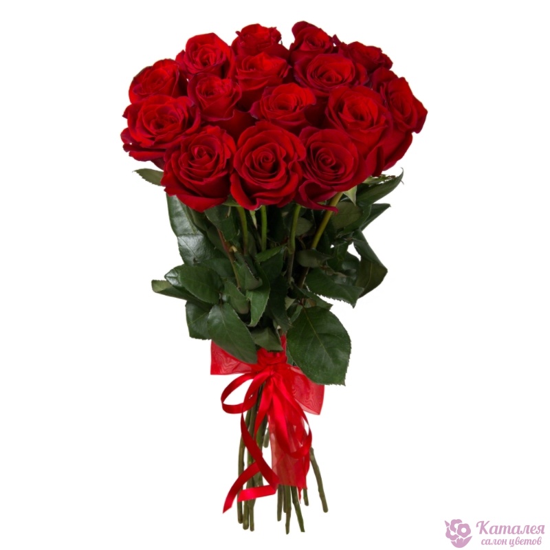 Букет состоит из 17 красных роз, прозрачная упаковка, атласная лента.
