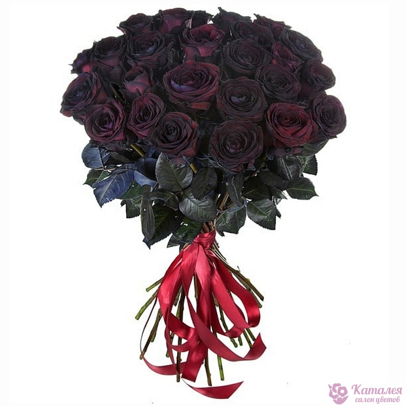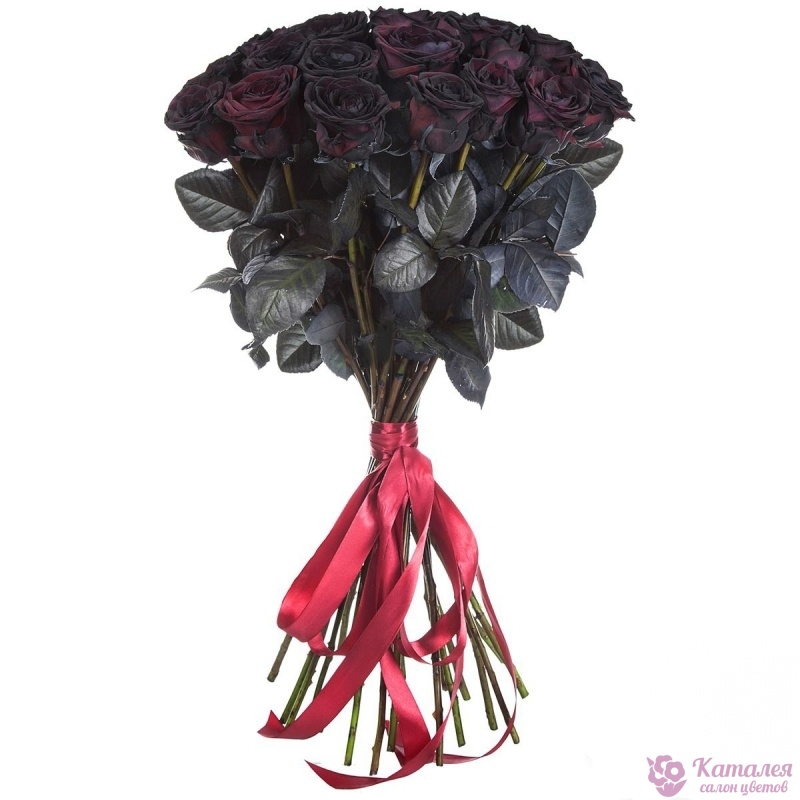 Букет состоит из 25 черных роз, прозрачная упаковка, атласная лента.