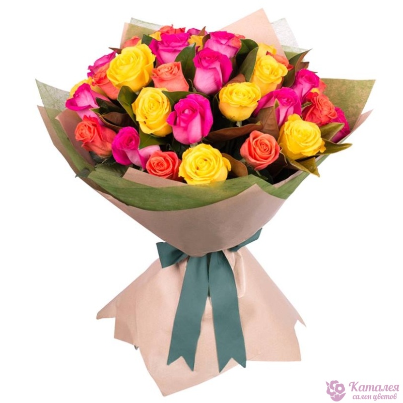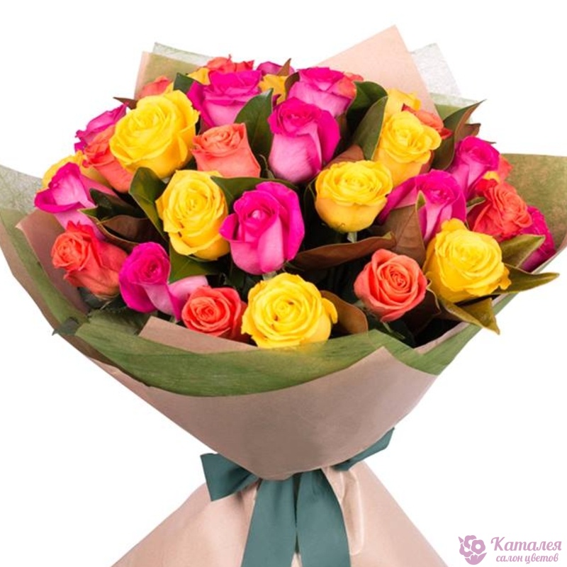 Букет состоит из MIX из 31 розы, крафт, атласная лента.