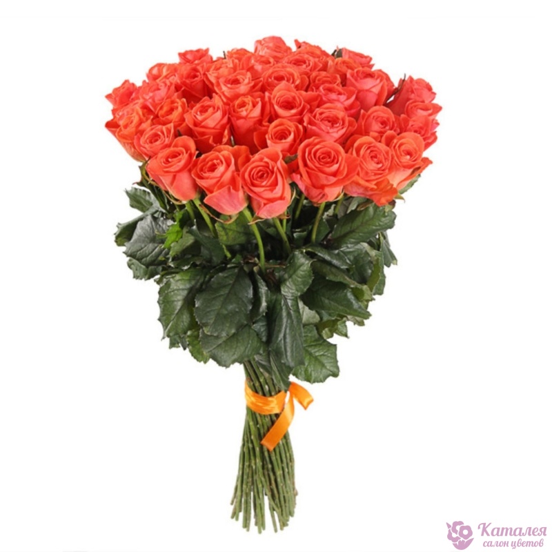 Букет состоит из 55 коралловых роз, прозрачная упаковка, атласная лента.