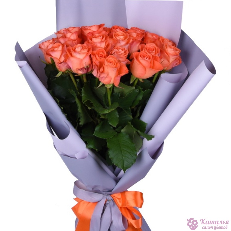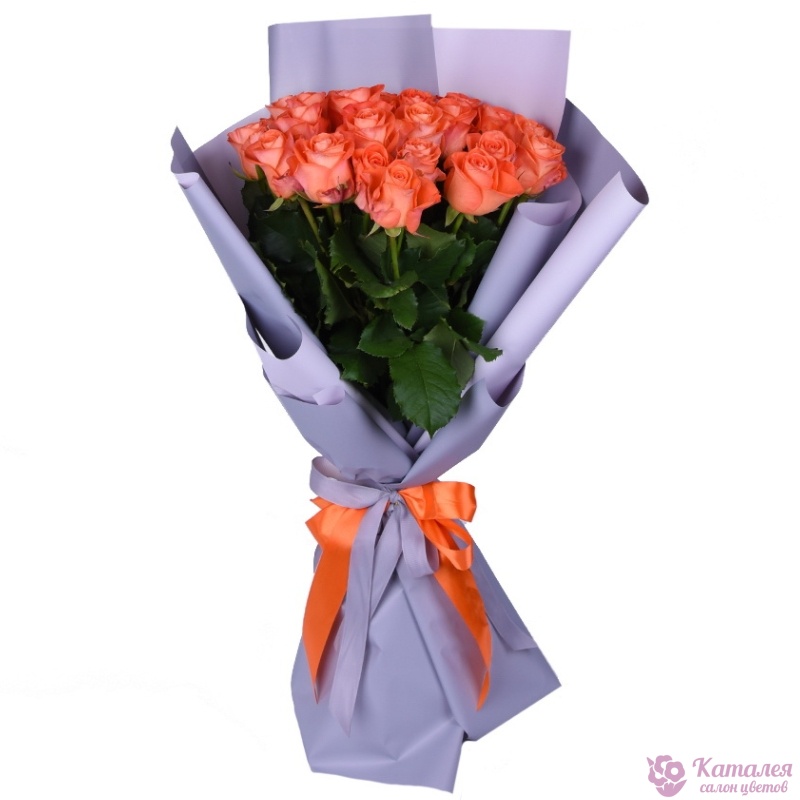 Букет состоит из 19 коралловых роз, красивая упаковка, атласная лента.