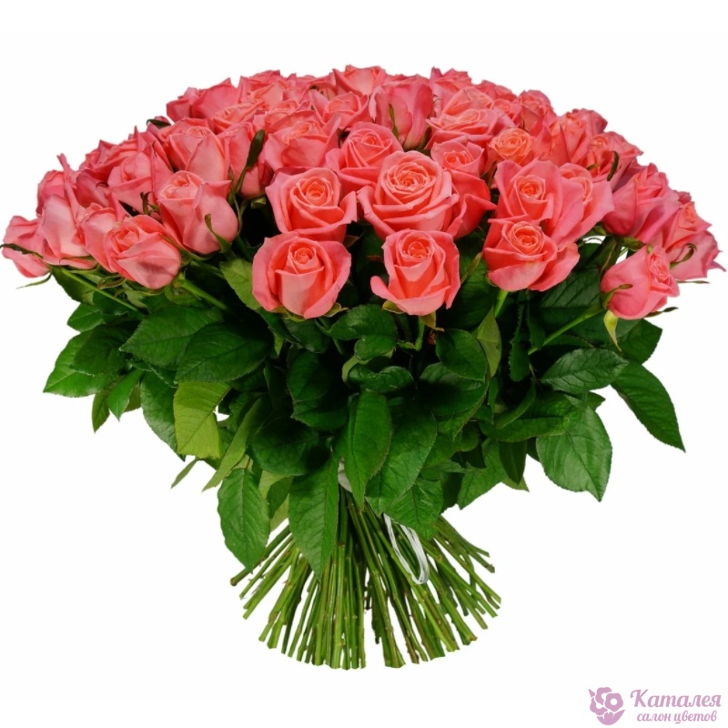 Букет состоит из 55 коралловых роз, прозрачная упаковка, атласная лента.
