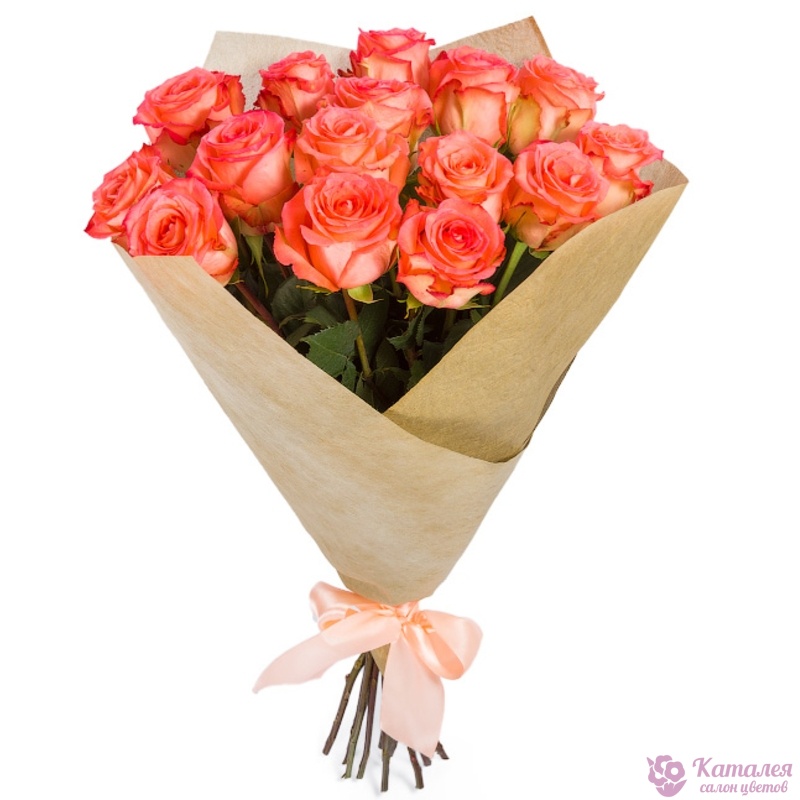 Букет состоит из 15 коралловых роз, крафт, атласная лента.