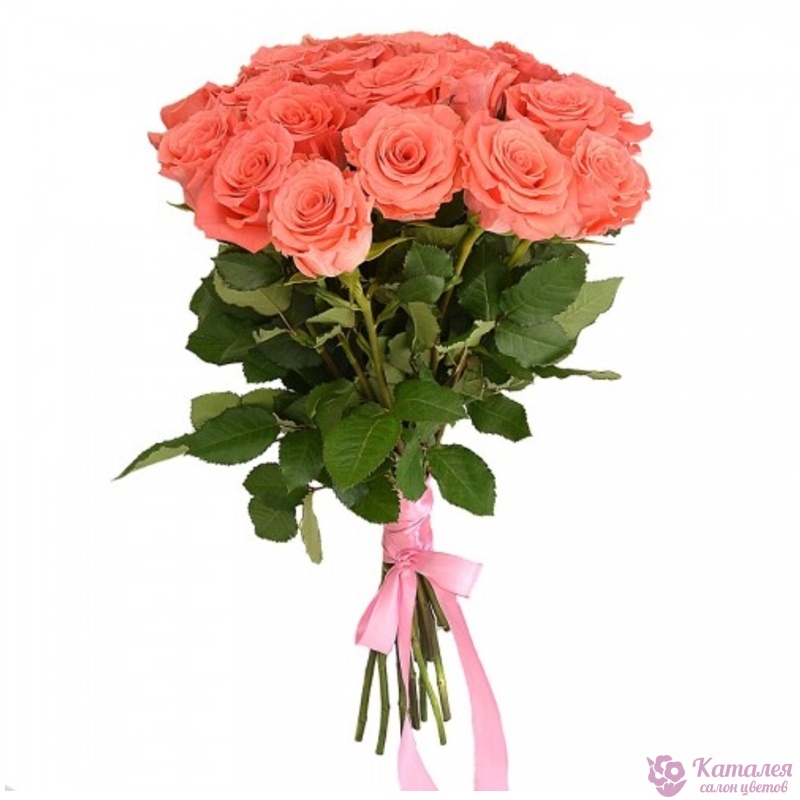 Букет состоит из 25 коралловых роз, прозрачная упаковка, атласная лента.