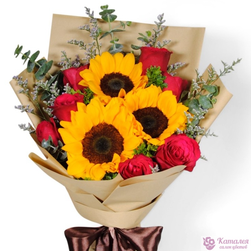 Букет состоит из 10 красных роз, 3 подсолнуха, декоративная зелень, крафт, атласная лента.