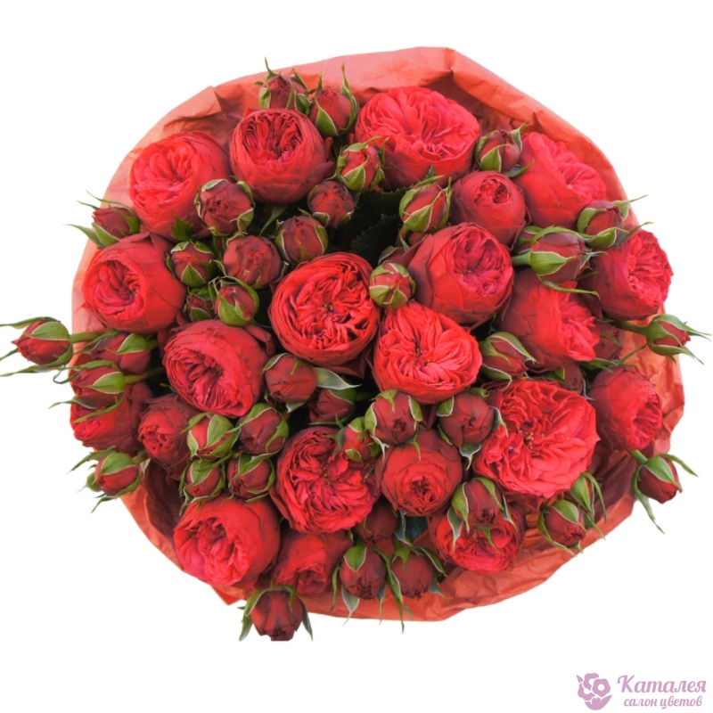 Букет состоит из 21 ветка кустовой розы Red Piano, крафт, атласная лента.