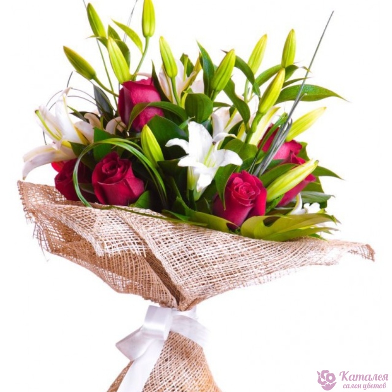 Букет состоит из 7 красных роз, 3 белых лилии, зелень, сетка, атласная лента.