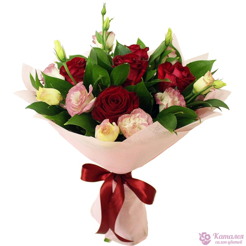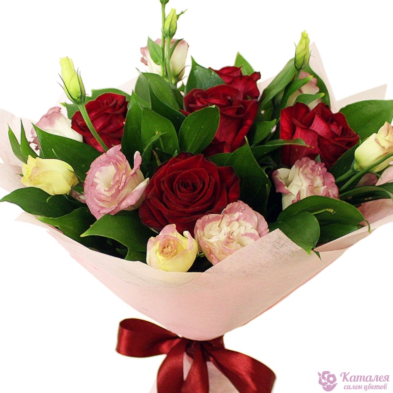 Букет состоит из 5 красных роз, 3 ветки эустомы, зелень, красивая упаковка, атласная лента.