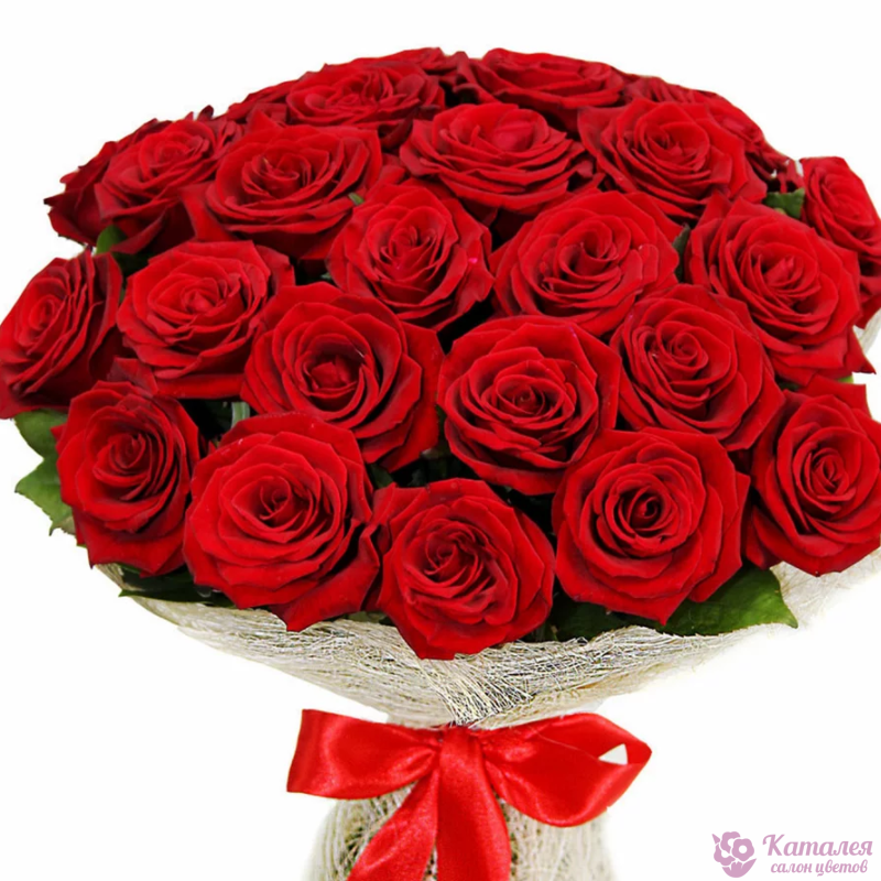 Букет состоит из 25 красных роз, красивая упаковка, атласная лента.