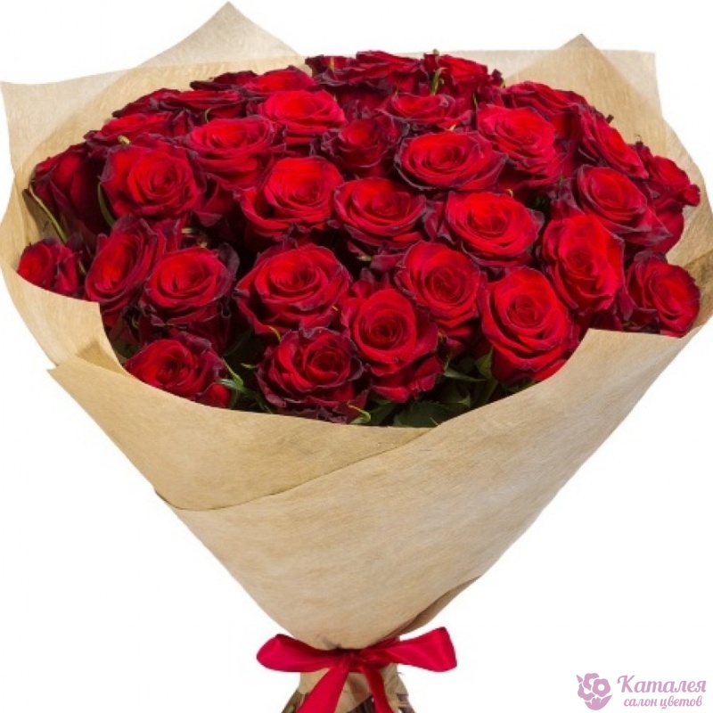 Букет состоит из 31 красная роза, крафт, атласная лента.