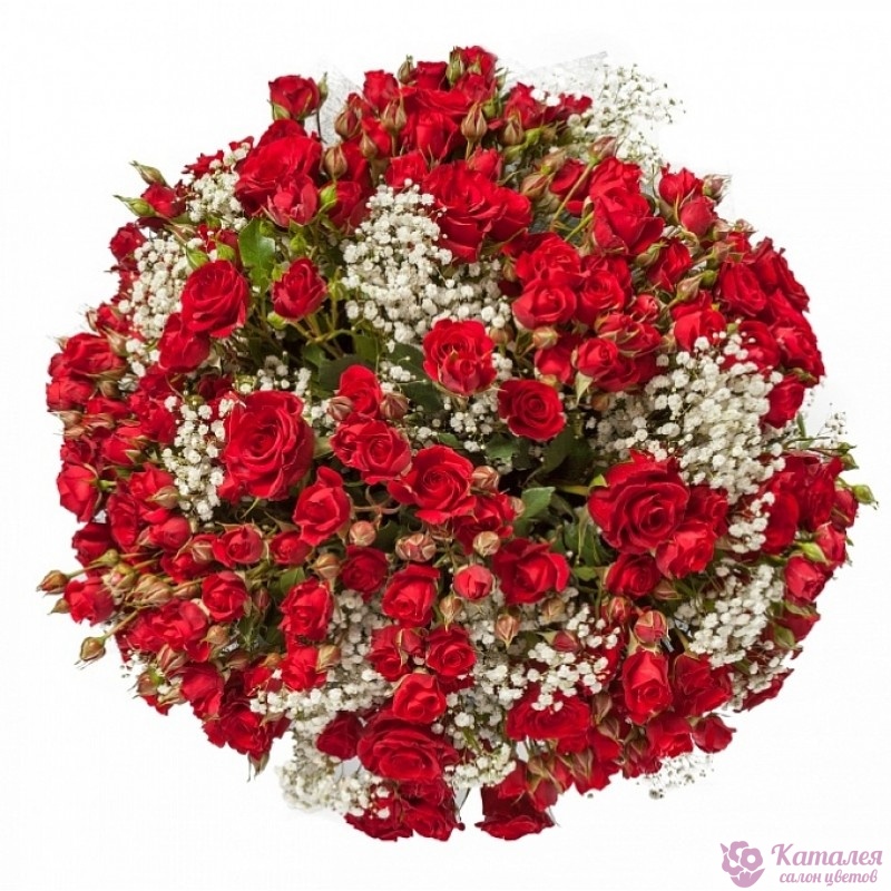 Букет состоит из 51 красная кустовая роза, 10 веток гипсофилы, сизаль, атласная лента.