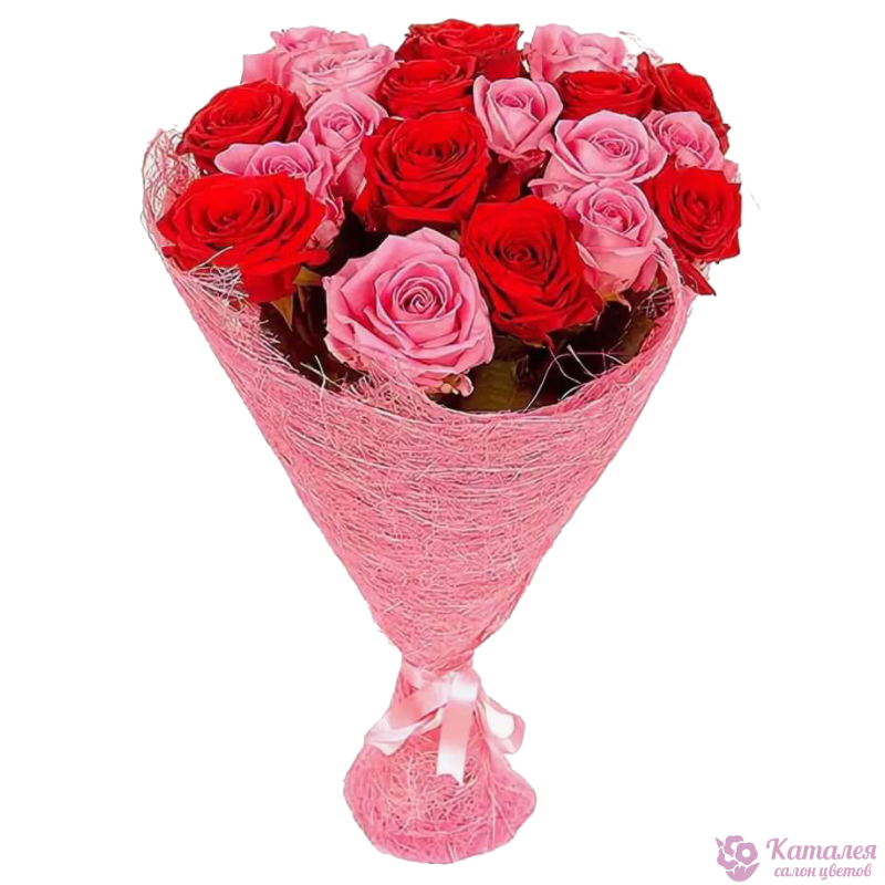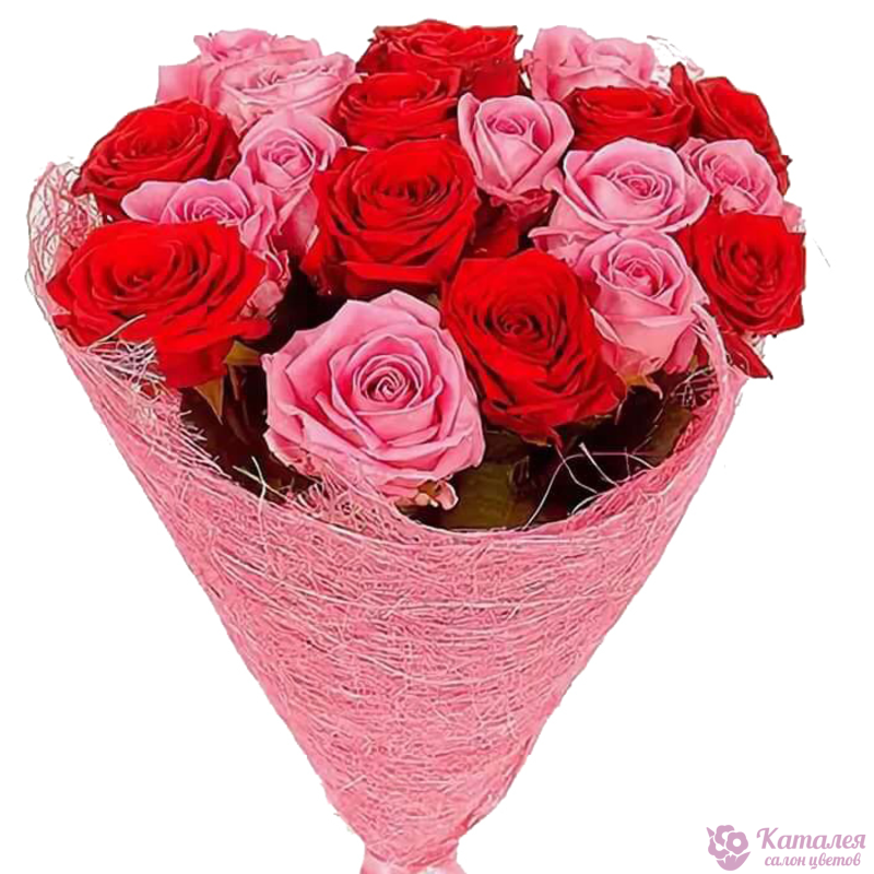 Букет состоит из 11 розовых роз, 10 красных роз, красивая упаковка, атласная лента.