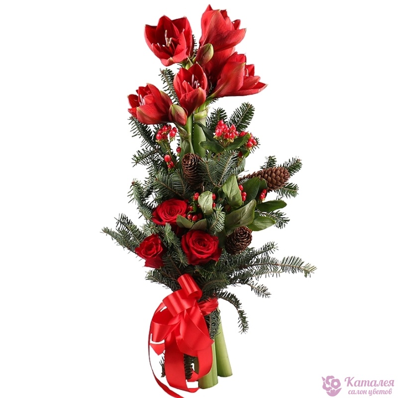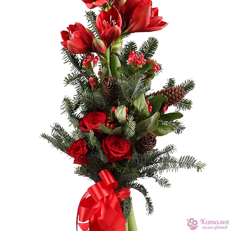 Букет состоит из 3 амариллиса, 3 розы, 1 ветка гиперикума, ель, шишки, прозрачная упаковка, атласная лента.