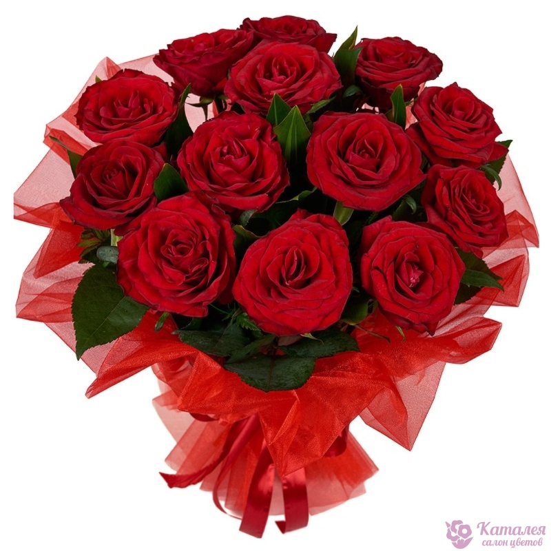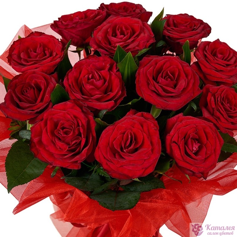 Букет состоит из 17 красных роз, упаковка, лента.