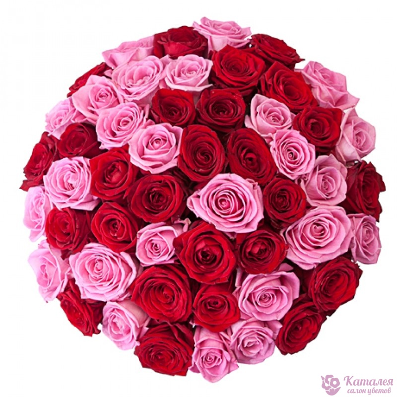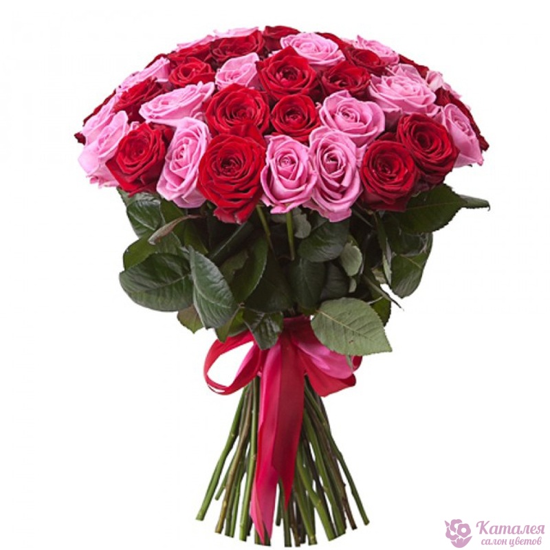 Букет состоит из 51 розовая и красная роза, прозрачная упаковка, атласная лента.