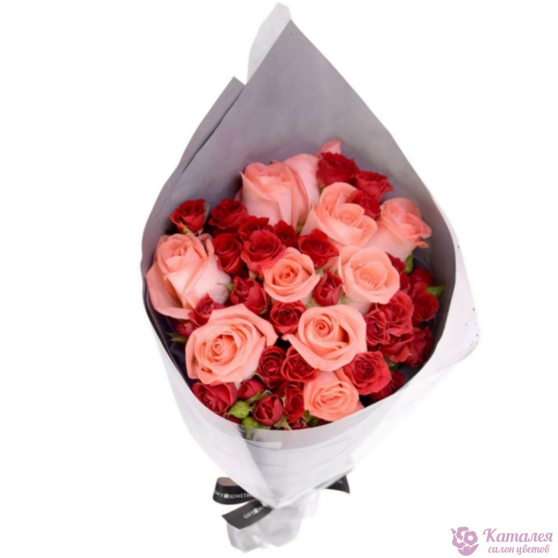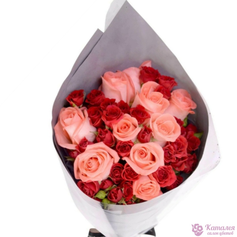 Букет состоит из 11 коралловых роз, 6 веток красных роз, красивая упаковка, атласная лента.