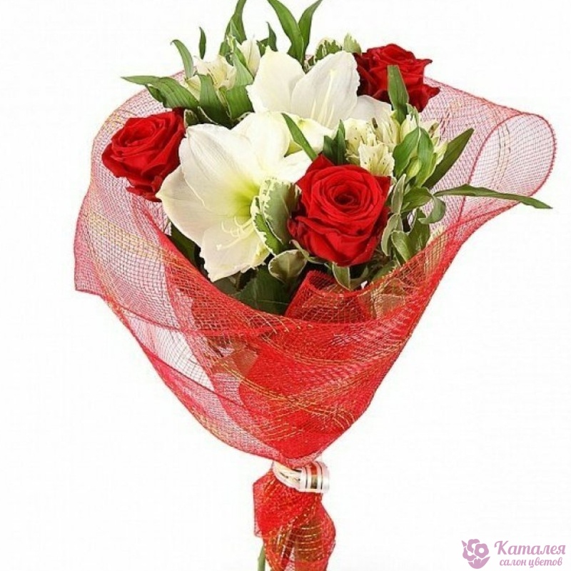 Букет состоит из 3 розы, 2 ветки альстромерии, 1 амариллис, питтоспорум, красивая упаковка, атласная лента.