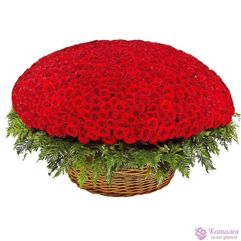 Букет состоит из 1001 красная роза, зелень, корзина.
