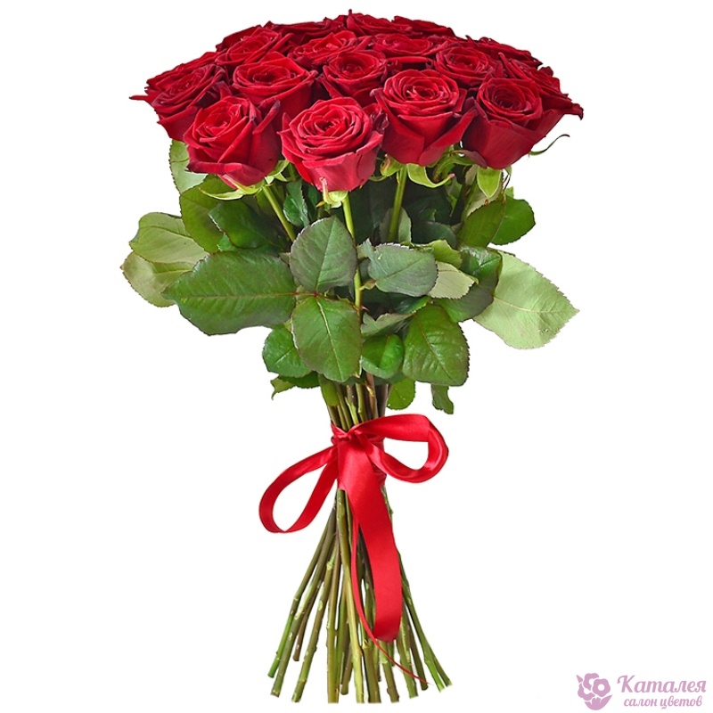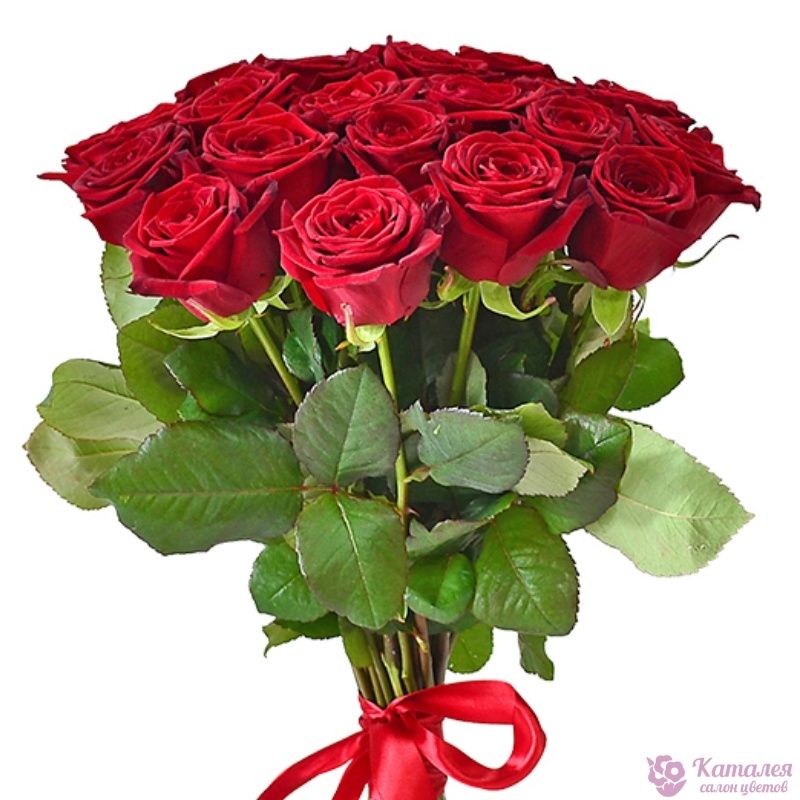 Букет состоит из 27 красных роз, прозрачная упаковка, красная лента.