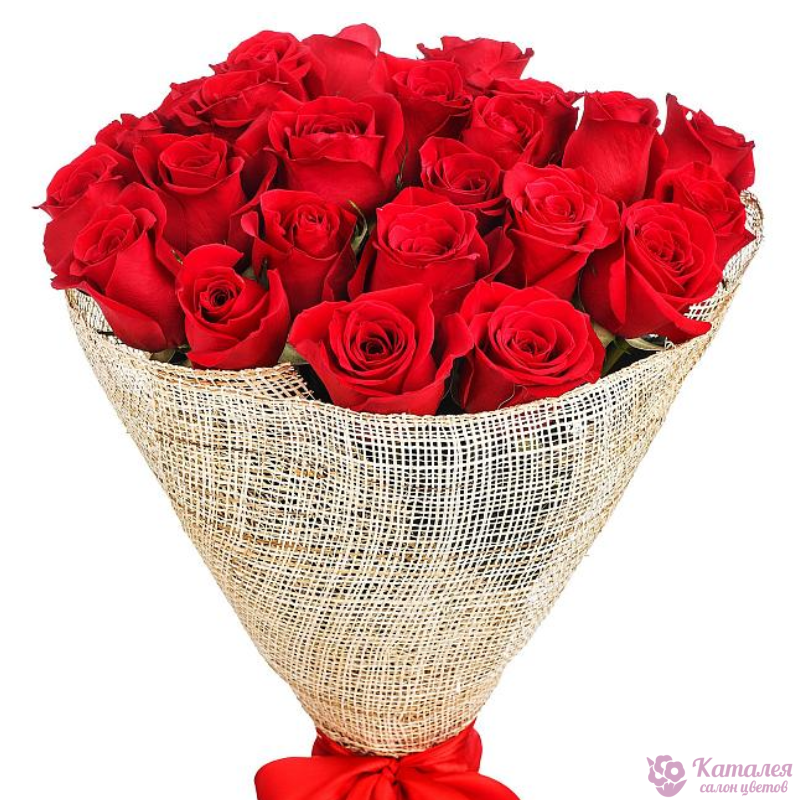Букет состоит из 25 красных роз, сетка, атласная лента.