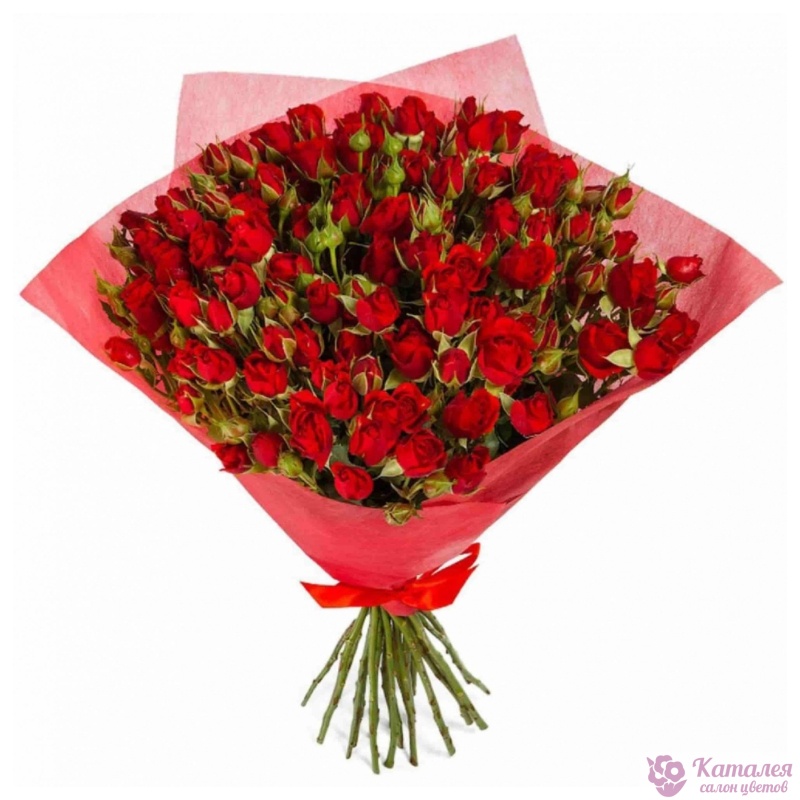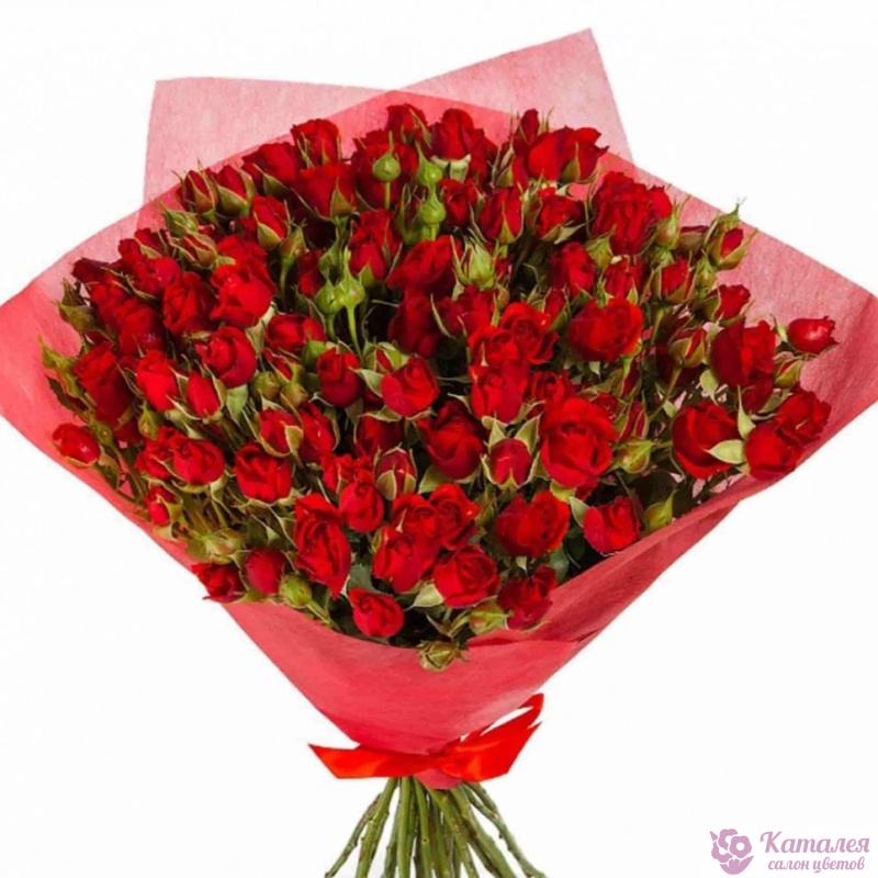 Букет состоит из 15 красных кустовых роз, красивая упаковка, атласная лента.
