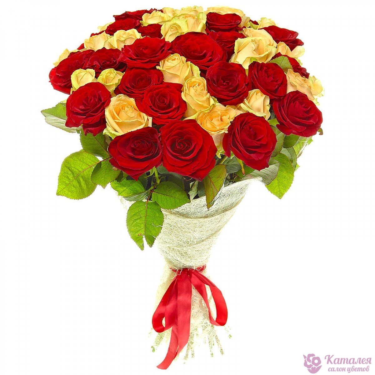 Букет состоит из 26 красных роз, 25 желтых роз, зелень, красивая упаковка.