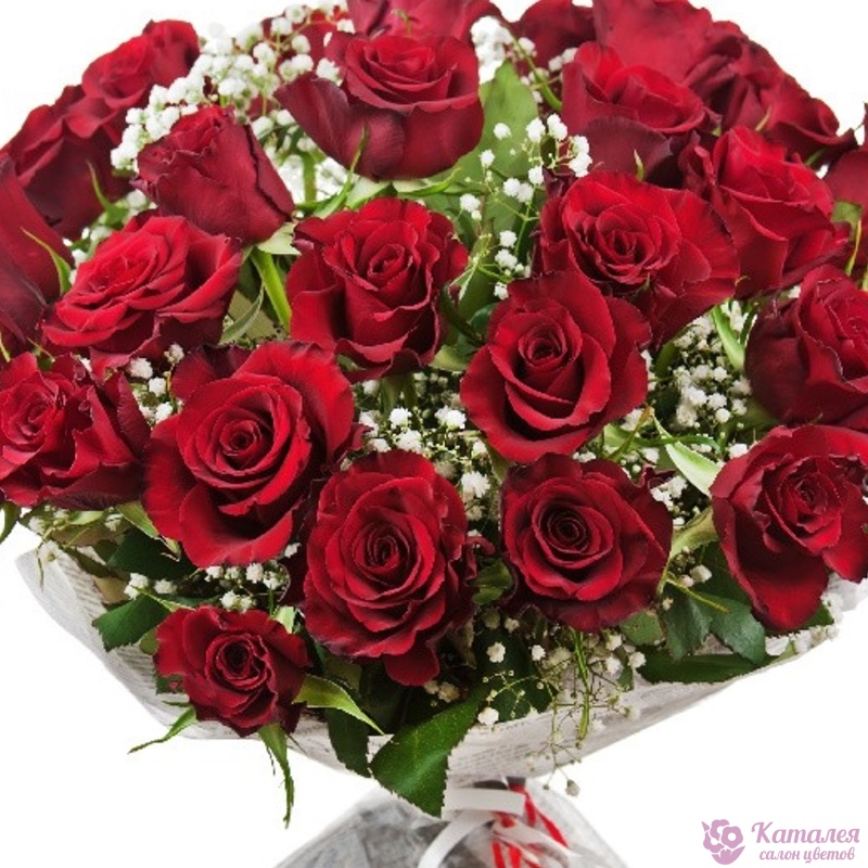 Букет состоит из 31 красная роза, 7 гипсофила, красивая упаковка, атласная лента.