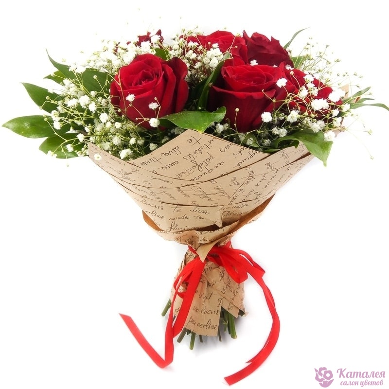 Букет состоит из 9 красных роз, 2 ветки гипсофилы, крафт, атласная лента.