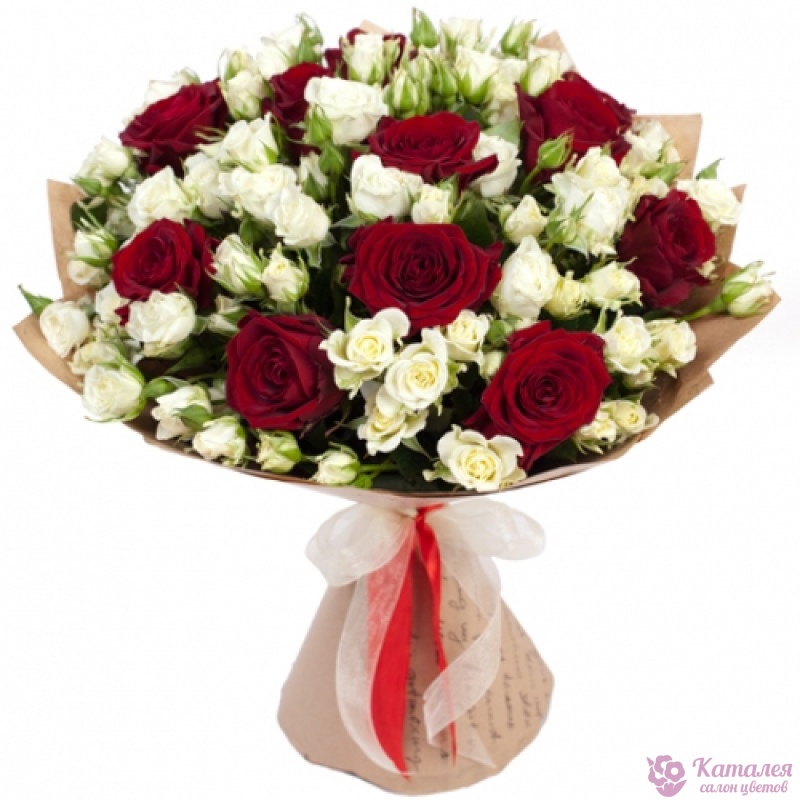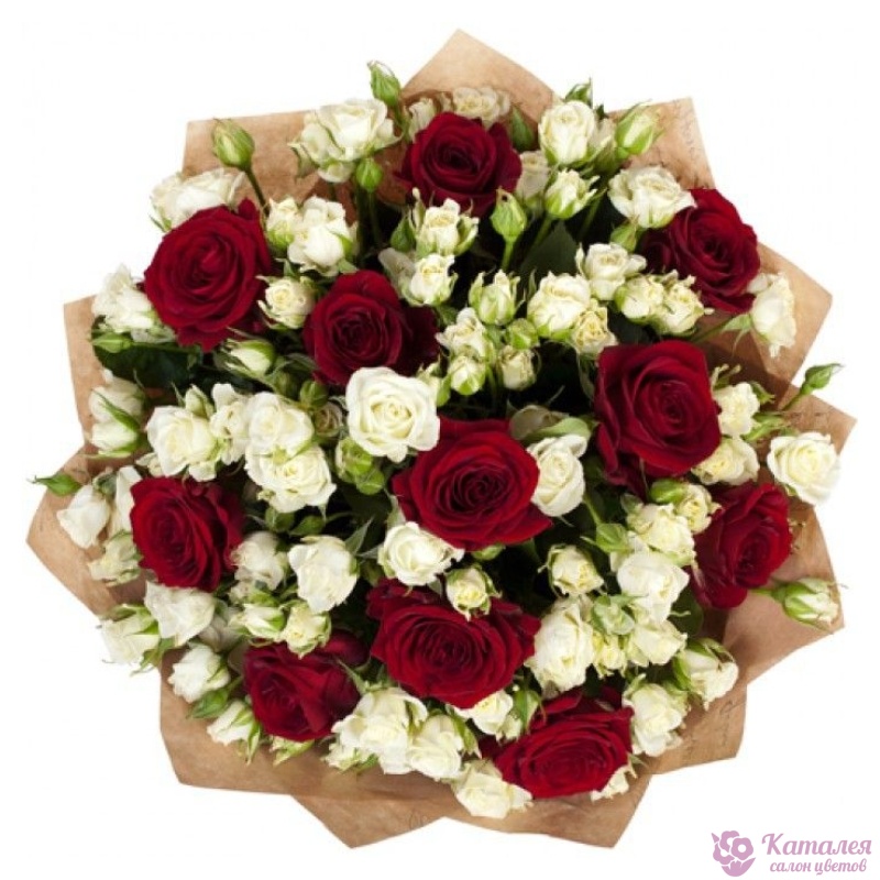 Букет состоит из 11 красных роз, 9 веток белой кустовой розы, крафт.